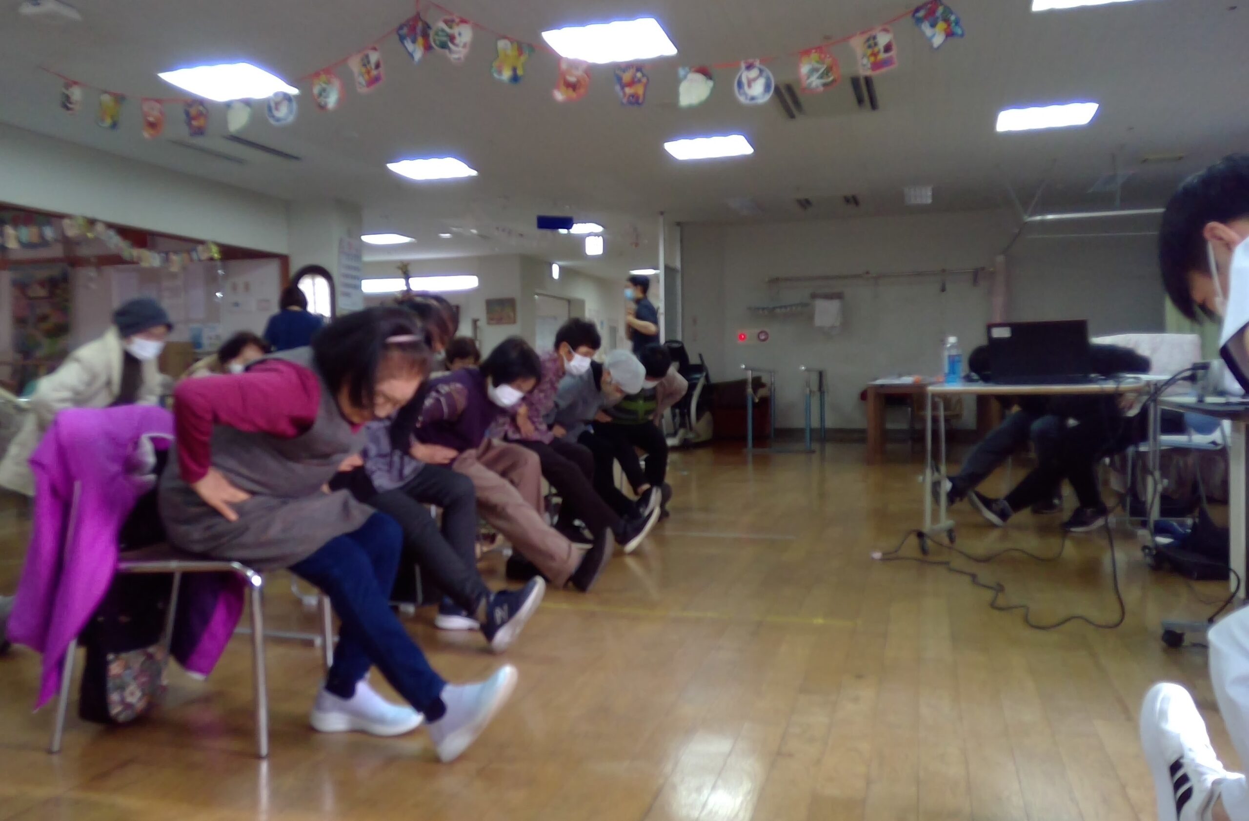 集団活動の時間は、椅子に座ったままできるストレッチを紹介し、参加者の皆さんそれぞれの無理のない範囲で体を動かす様子がありました。