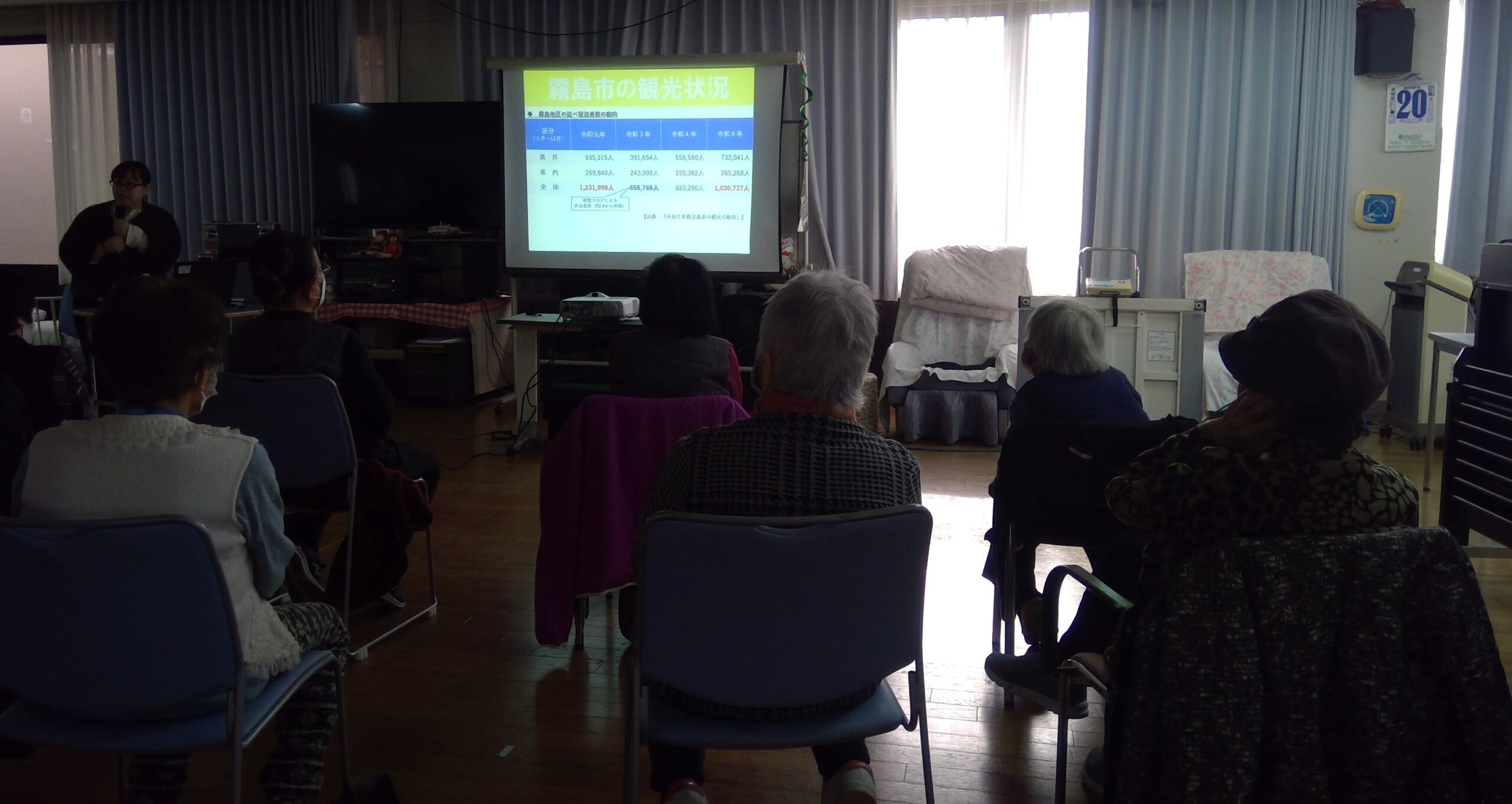 講話の時間は、霧島市が開講している霧島市出前講座に依頼し、今回は観光PR課の方から「霧島の魅力(食や観光)を丸ごと味わう。」というテーマで、霧島市の観光資源の話や観光PR課の取り組み等のお話をしていただきました。話の中には、住んでいても意外と知らない情報が多くあり、参加者の皆さんは興味深げに聞き入っていました。