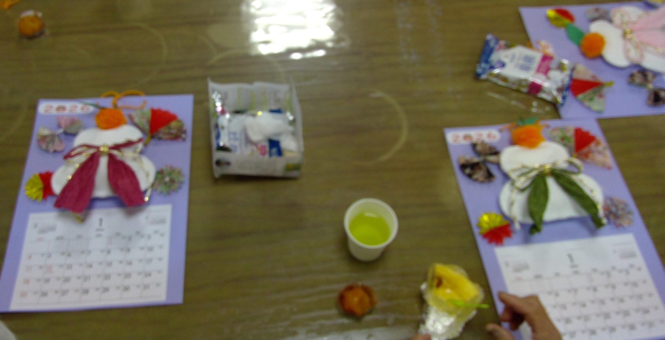 創作活動の時間は、来たる新年にちなんで、今回は鏡餅をモチーフとした切り絵のついたカレンダーを作成していただきました。また、カレンダー作成後には職員が準備したケーキときんかん漬けの振る舞いがあり、参加者の皆さんは喜んで食されていました。
