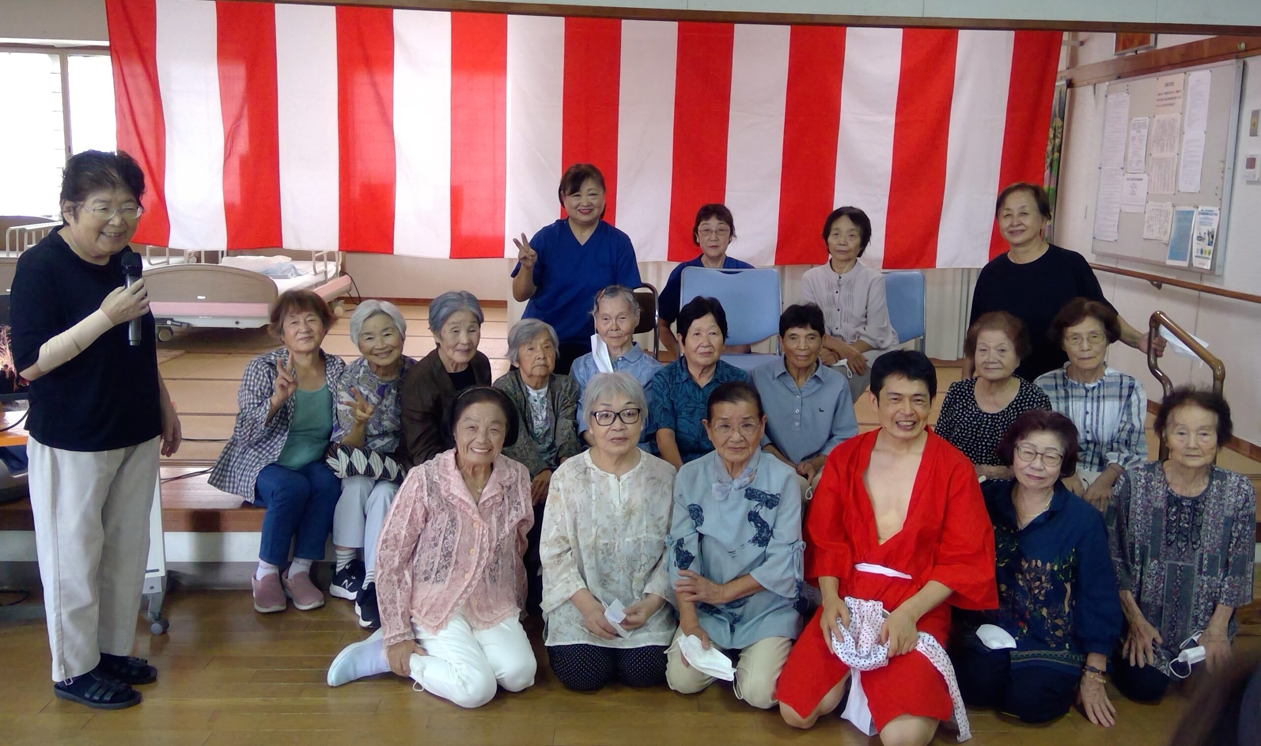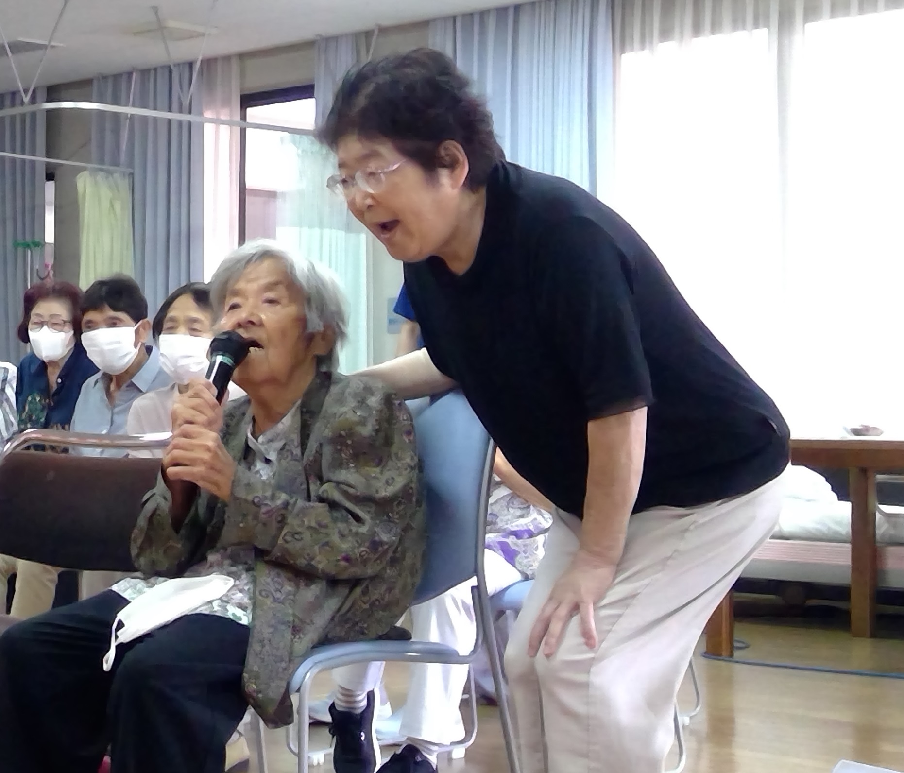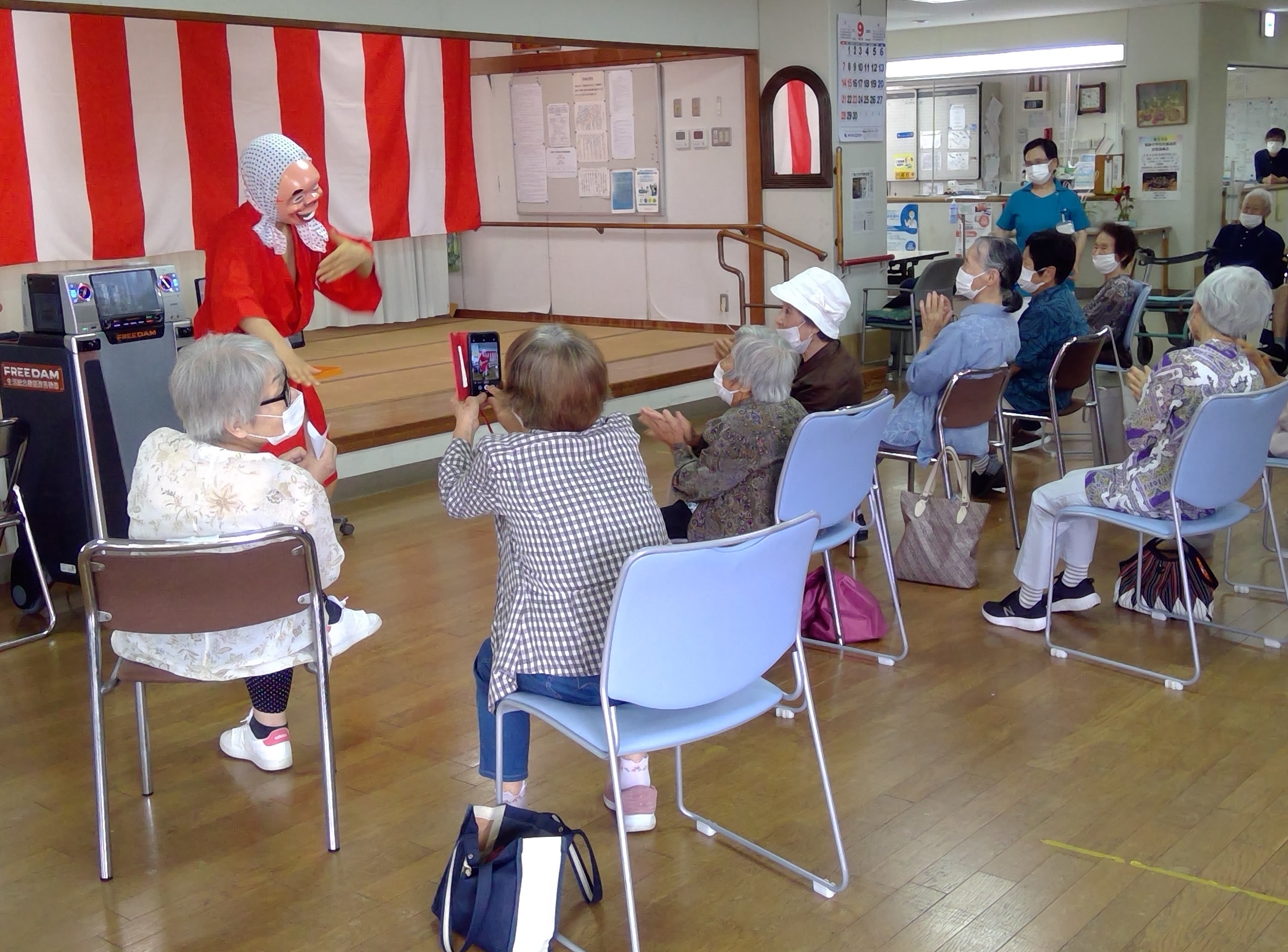 敬老会は、参加者によるハーモニカ演奏、職員による踊りの披露、参加者・職員を交えたカラオケ大会等のプログラムが行われ、参加者も職員も身振り手振りを交え、時には一緒に歌うなどしながら、大いに楽しんでいました。会の終わりには、敬老祝いとして、紅白まんじゅうが参加者に贈られました。