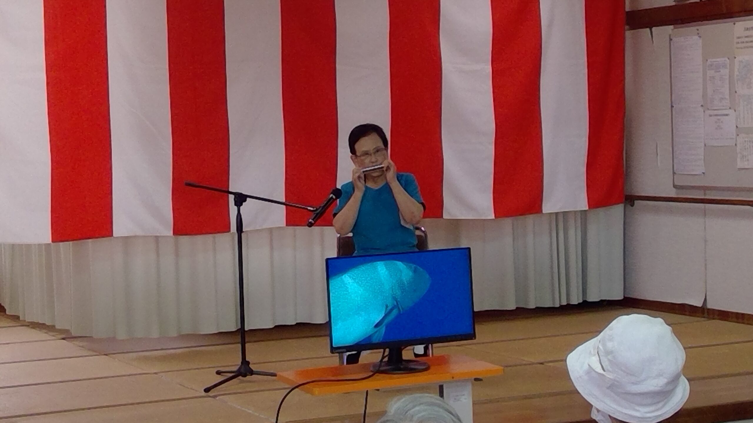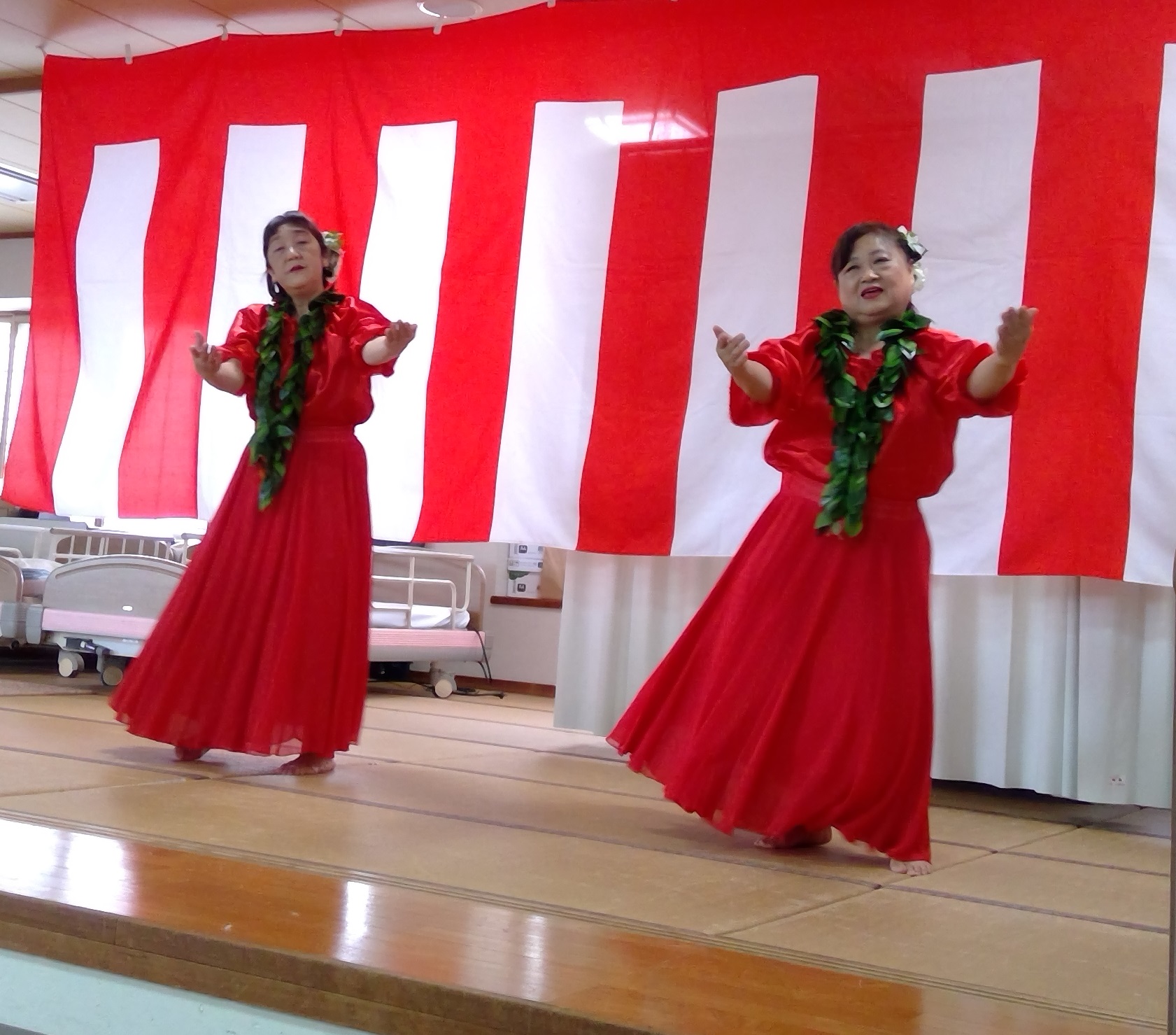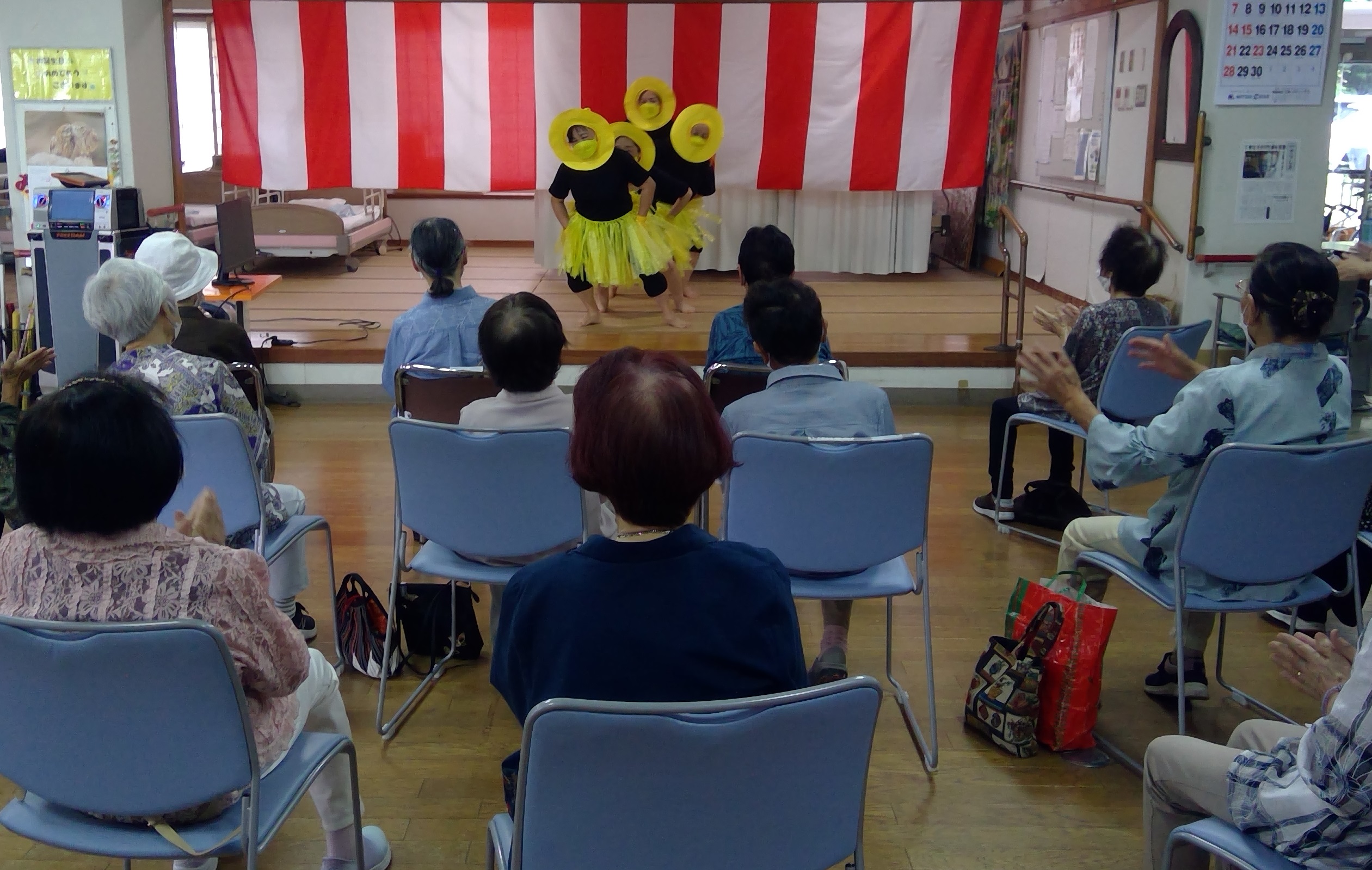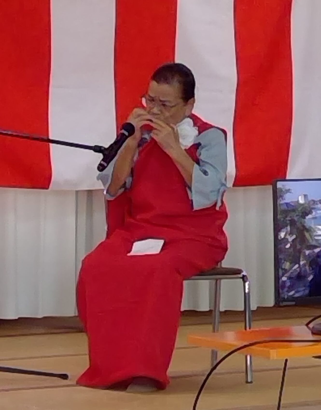 敬老会は、参加者によるハーモニカ演奏、職員による踊りの披露、参加者・職員を交えたカラオケ大会等のプログラムが行われ、参加者も職員も身振り手振りを交え、時には一緒に歌うなどしながら、大いに楽しんでいました。会の終わりには、敬老祝いとして、紅白まんじゅうが参加者に贈られました。
