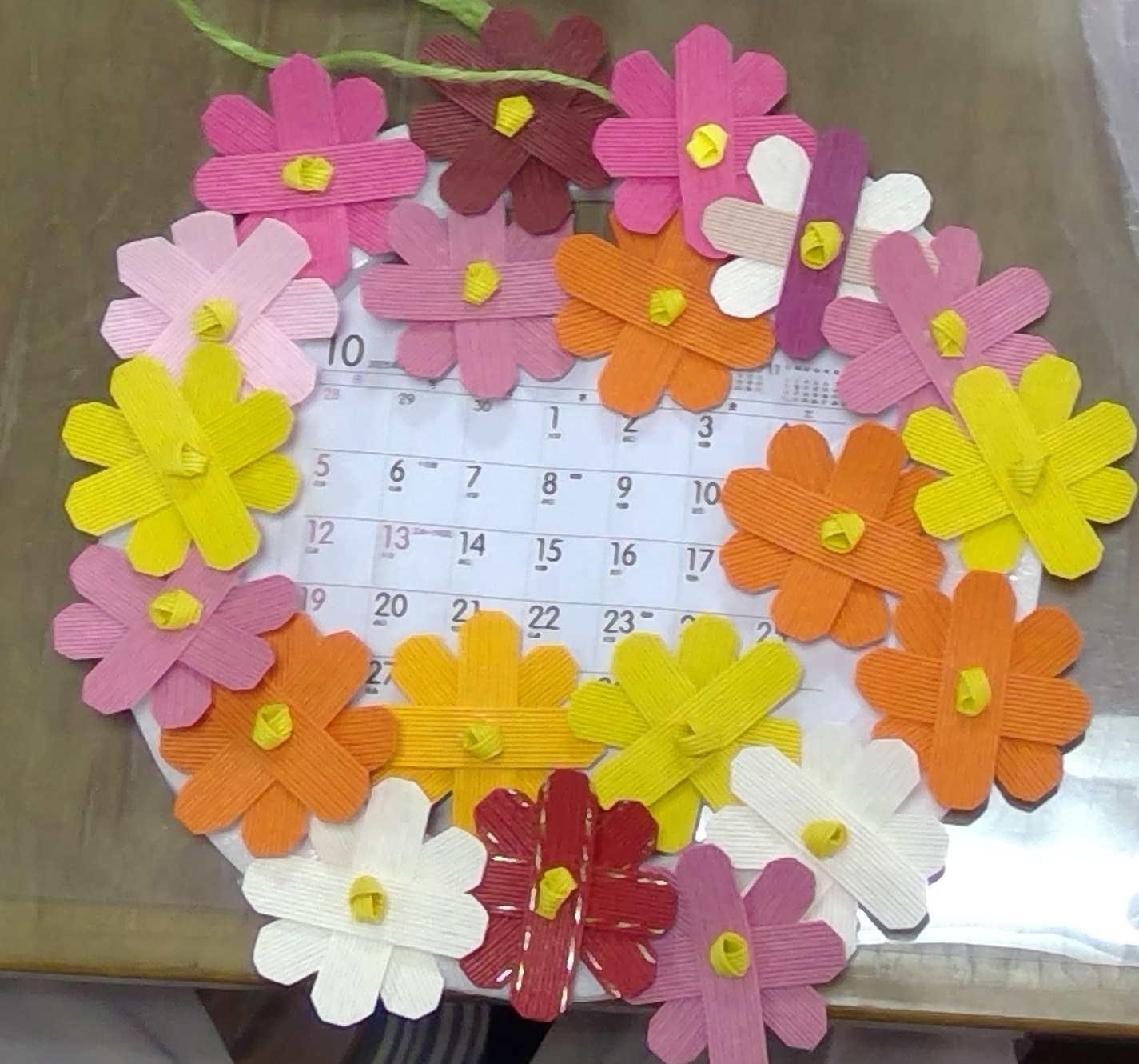 創作活動では、10月のイメージにちなんで、コスモスをモチーフとしたカレンダー作りに取り組んでいただきました。