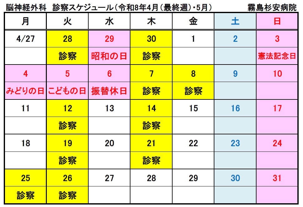 令和8年4月最終週および5月の脳神経外科の診察スケジュールは、下の表のとおりとなっておりますので、ご確認下さい。(先月末(2026年3月26日)にお知らせした日程と変更はありません。)